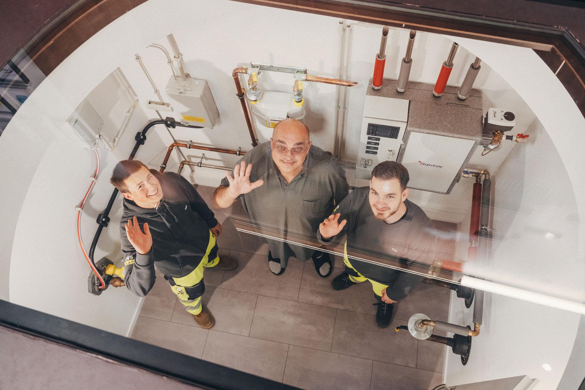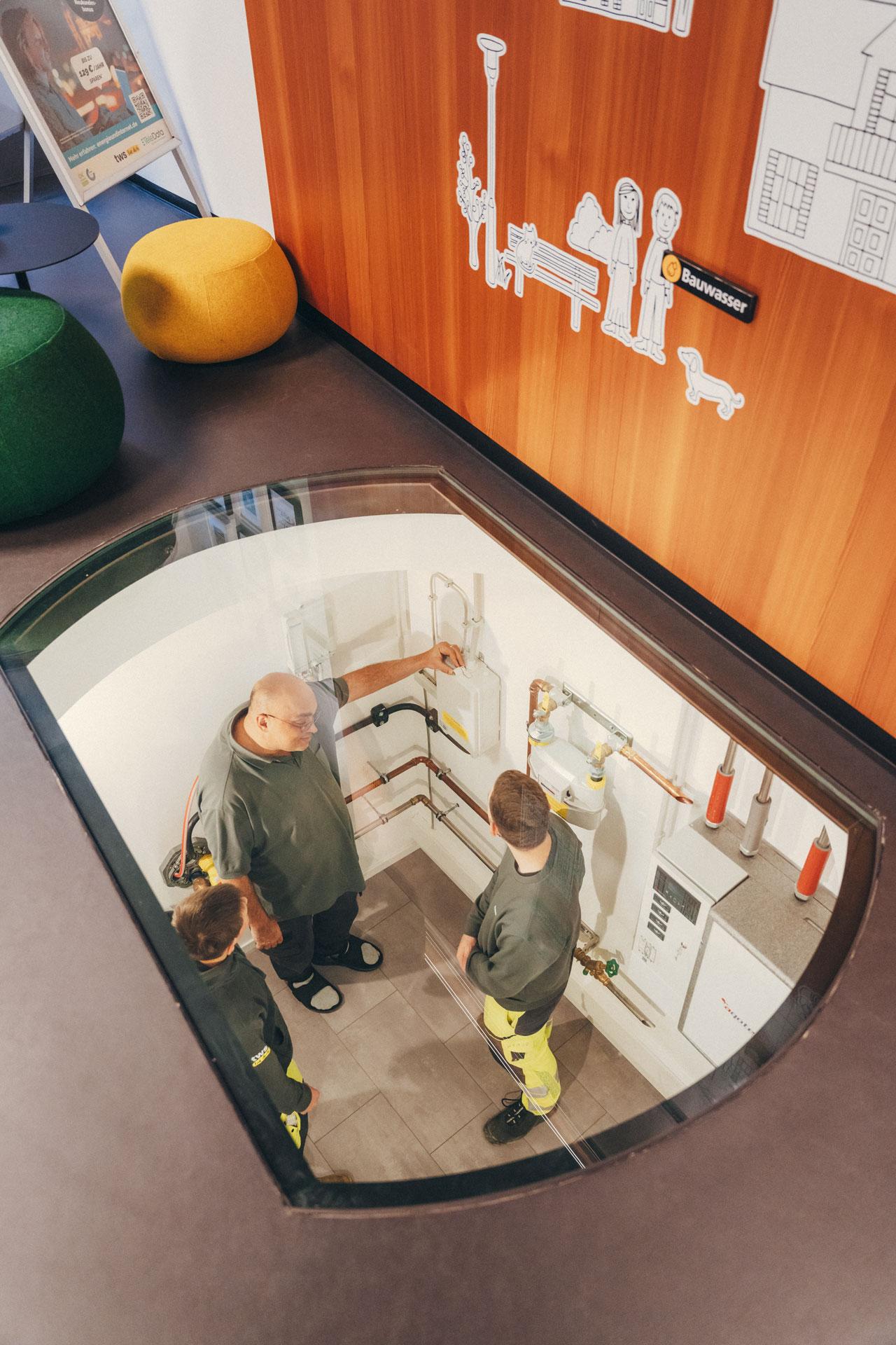 Die Auszubildenden hatten freie Hand bei der Umsetzung des Projektes, wurden bei Bedarf aber von allen Seiten unterstützt. Wichtig war das beispielsweise für den Trockenbau der Wände im Showroom, auf denen nun die Installation der Anschlüsse zu sehen ist. Drazen Bakic freut sich, dass seine Idee Wirklichkeit wurde: „Das ist sogar noch besser geworden, als ich es mir gedacht habe: Mit der Beleuchtung und unter der Glasplatte sieht der Showroom richtig toll aus!“ Auch Peter Läßle, Leiter des Kundencenters Weingarten, lobt das Engagement der Auszubildenden und die professionelle Umsetzung. „Außerdem sind unsere Kund:innen sehr interessiert daran und es ist gut, dass ich die Anschlüsse jetzt zeigen kann. Vor allem die Frage nach der Wärmeübergabestation kommt öfter, seit die Fernwärme für Weingarten geplant ist“, berichtet er. Denn besonders eindrucksvoll wird jetzt im Showroom deutlich, wie wenig Platz eine Wärmeübergabestation im Vergleich zur herkömmlichen Heizung tatsächlich braucht.